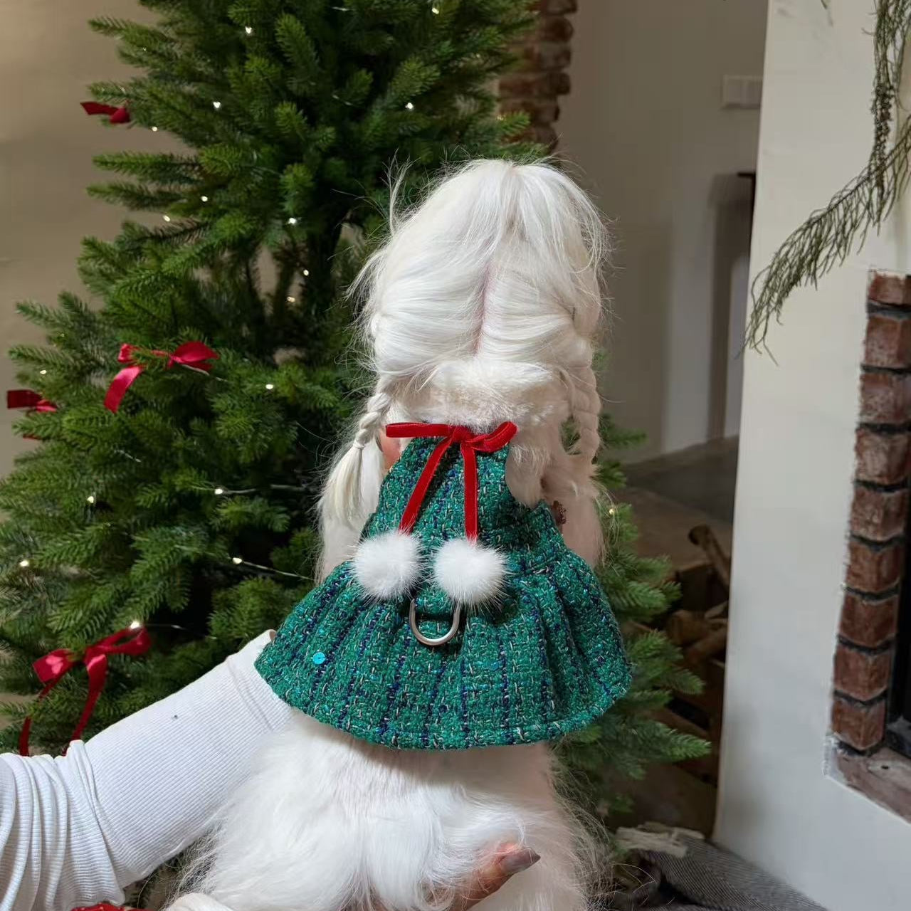 This festive set features a red plaid frill dress and a green fur halter tweed dress — both made from soft, lightweight polyester for a cozy yet elegant look.