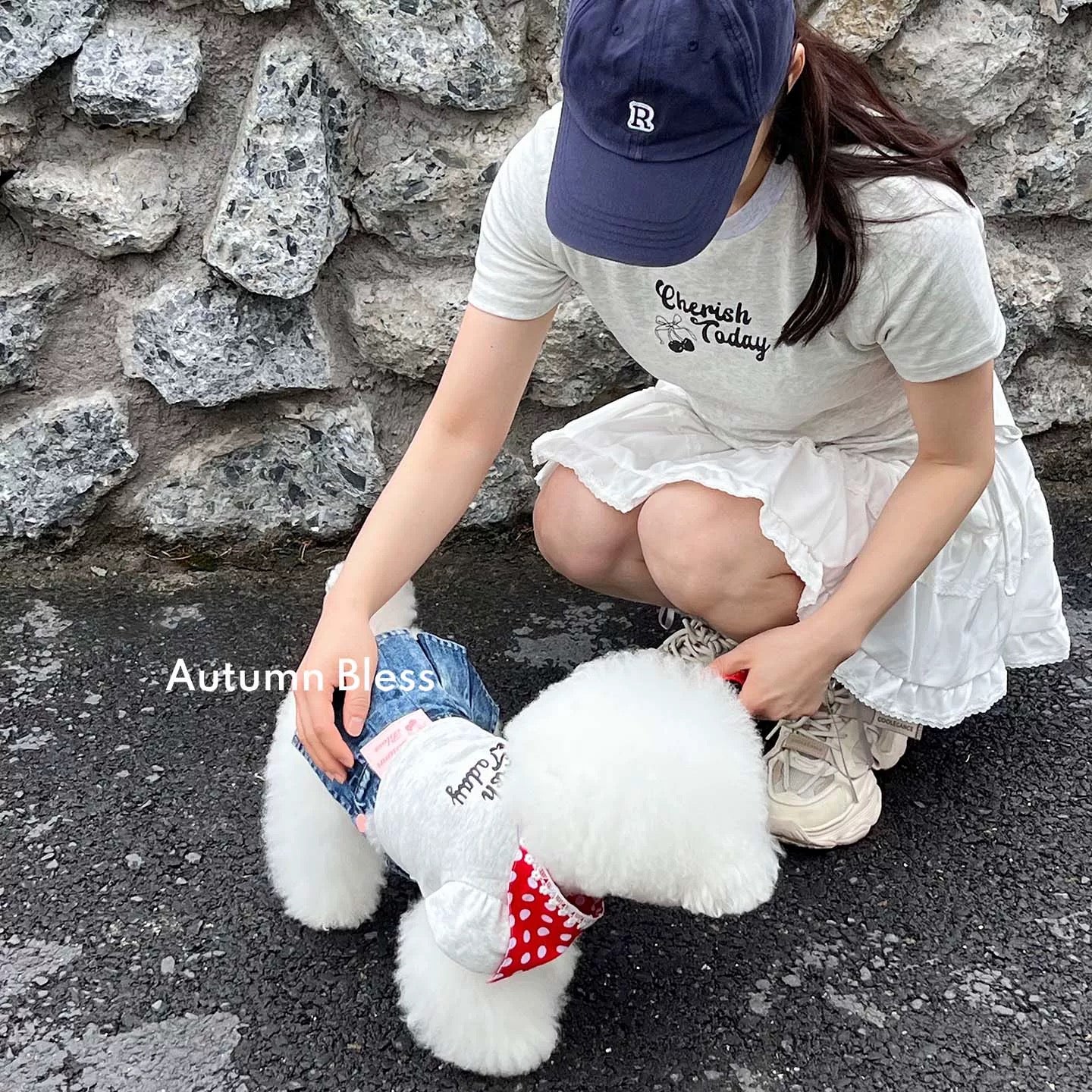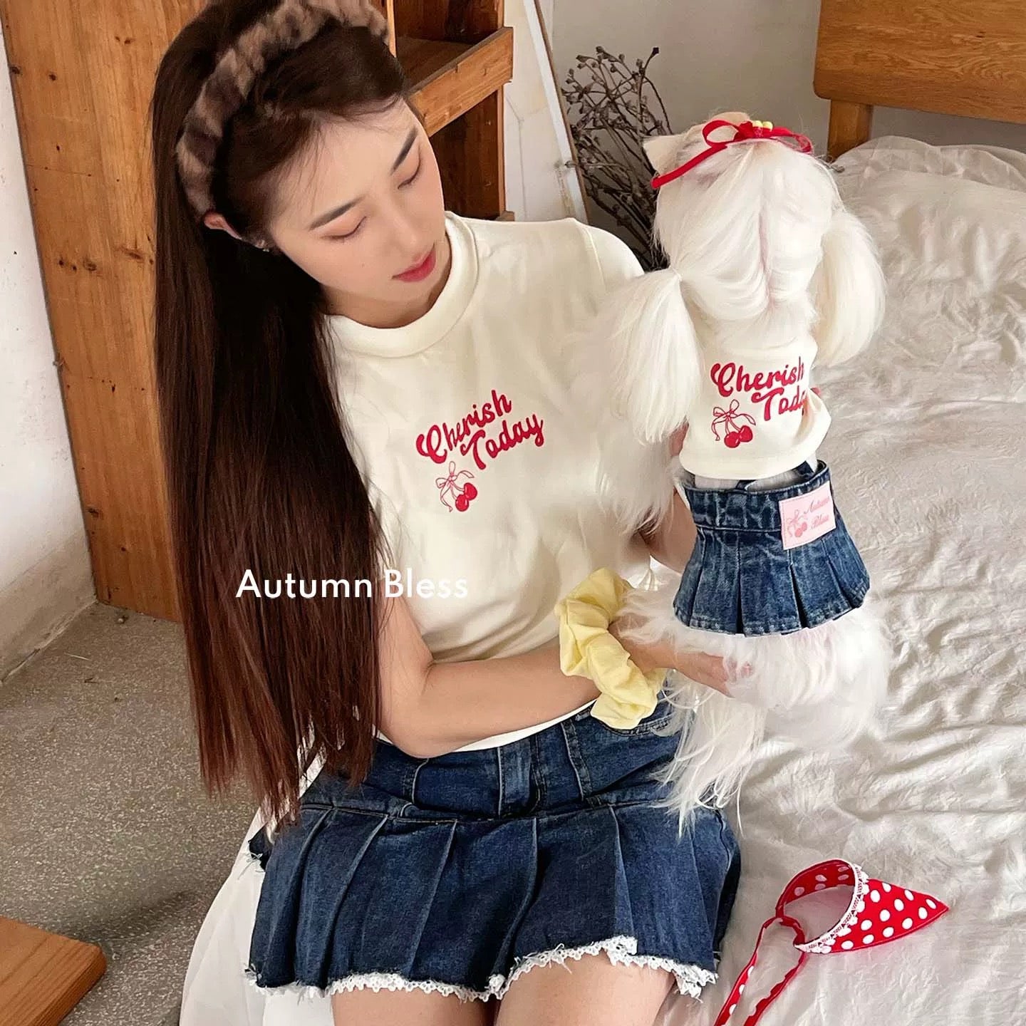 ・犬用:チェリーTシャツ(グレー/ホワイト)+デニムスカート+アクセサリー(ヘアピン or バンダナ)